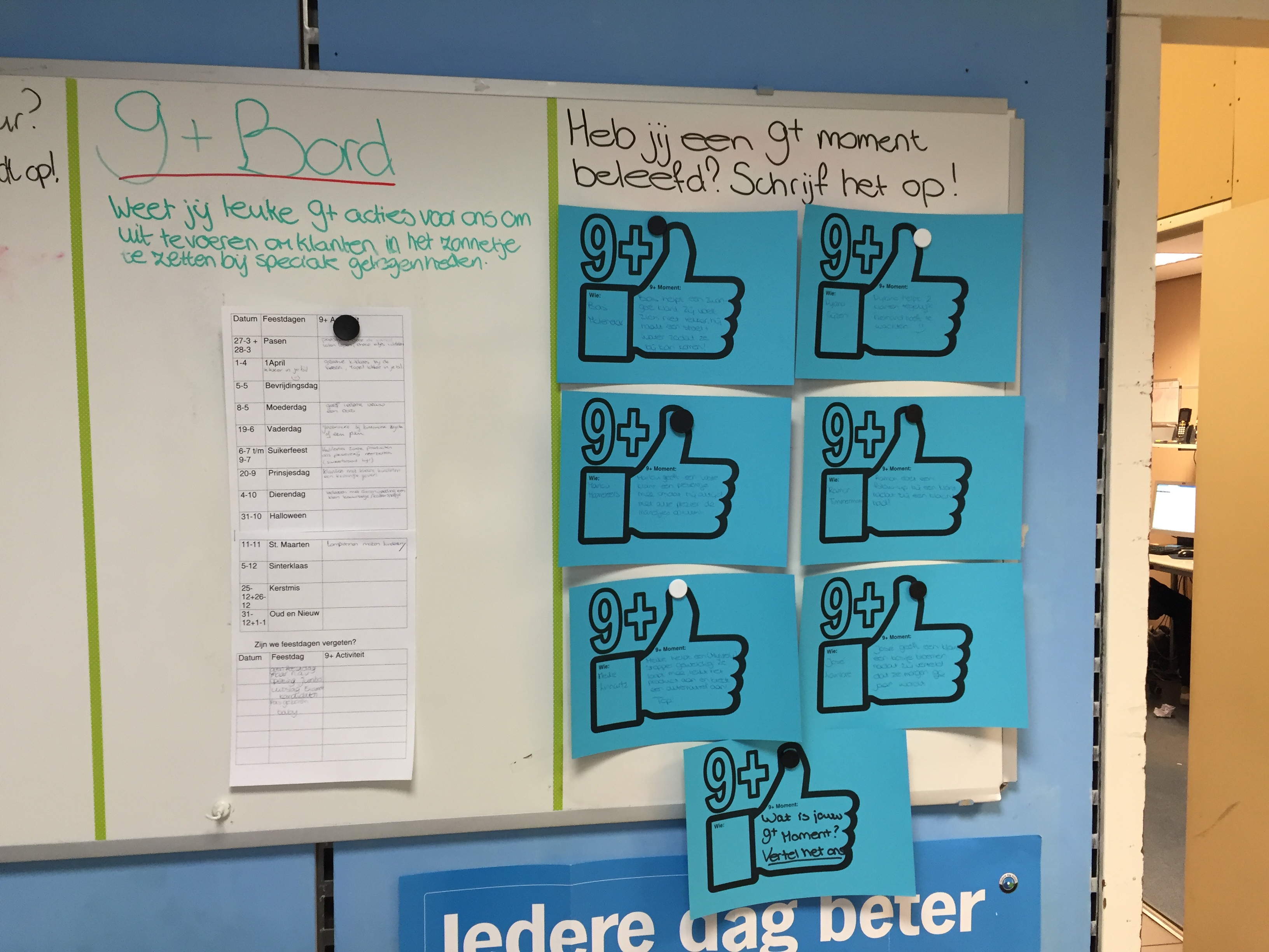 Een voorbeeld om binnen het filiaal te communiceren over 9+ momenten is het maken van een successenbord. Naast het creëren van deze borden bij het IDB bord, kan ook het delen van service 9+ momenten via de medewerkers Facebookpagina een mogelijkheid zijn. Op deze manier kunnen medewerkers elkaar inspireren en motiveren om service 9+ goed uit te voeren. Dit zijn voorbeelden van manieren waarop je 9+ meer kunt laten leven binnen je filiaal. De medewerkers komen er op deze manier vaker en concreter mee in aanraking. Het IDB bord, de nieuwsbrief, het vulshiftpraatje of het dagelijkse IDB moment kunnen ook als mogelijkheid dienen om service 9+ nog eens extra te benadrukken.